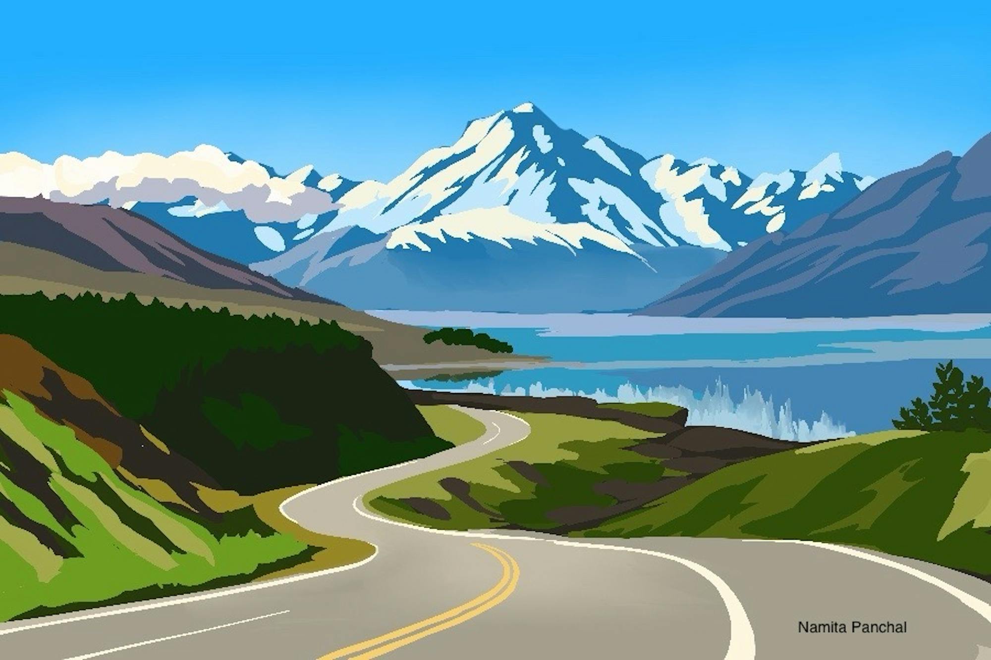 Now refine your shapes and add layers of midground and foreground details using more shapes for clouds, paths, water, etc. Keep everything clean and sharp.